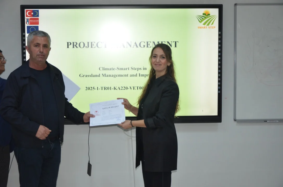 Eğitimin son gününde ayrıca, “İklim Dostu Mera Yönetimi ve Islahına Yönelik Adımlar” (Proje No: 2025-1-TR01-KA220-VET-000349844) projesi çiftçilere tanıtıldı.