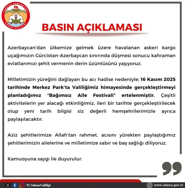 Adana Valiliği, Gürcistan-Azerbaycan sınırında düşen askeri kargo uçağında şehit olan kahraman askerler için bir açıklama yayımladı. Kamuoyuyla paylaşılan mesajda, “derin üzüntü içindeyiz” ifadeleri yer aldı.