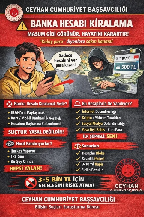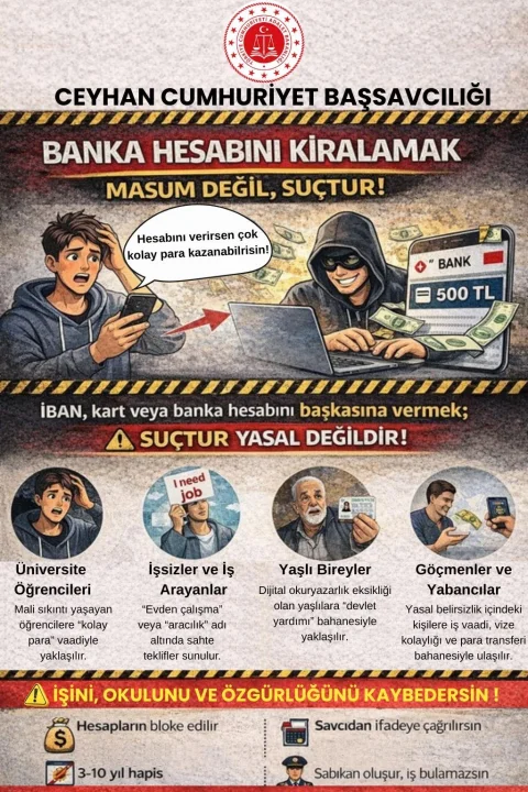 Ceyhan Cumhuriyet Başsavcılığı tarafından hazırlanan bilgilendirici görsellerle, banka hesabı kiralama ve başkasına kullandırma konusunda kamuoyuna önemli bir uyarı yapıldı. Açıklamada; IBAN paylaşmak, banka kartı ya da mobil bankacılık bilgilerini başkasına vermenin suç olduğu ve yasal karşılığının bulunduğu net bir dille ifade edildi.