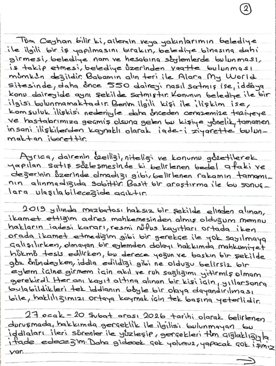 Aydar mektubunda, kendine ve ailesine yöneltilen suçlamaların hiçbir gerçeklik taşımadığını vurguladı. Aile bireylerinin belediye işleriyle ilişkilendirilmesinin mümkün olmadığını ifade ederek şu cümlelere yer verdi: