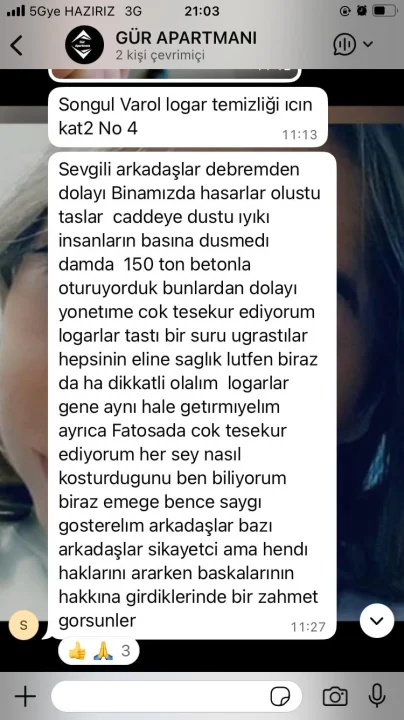 “Riskli bina olmasına rağmen sürekli duvarlar yıkılıp tadilat yapılıyor. Tek amaç para toplamak. Kimlik bilgilerimiz gruplarda paylaşılıyor, toplantı görüntülerimiz mahalledeki kötü şöhretli kişilere izletiliyor. Kendilerine karşı çıkanları hedef gösteriyorlar. Yetkililer bizi bu durumdan kurtarsın.”