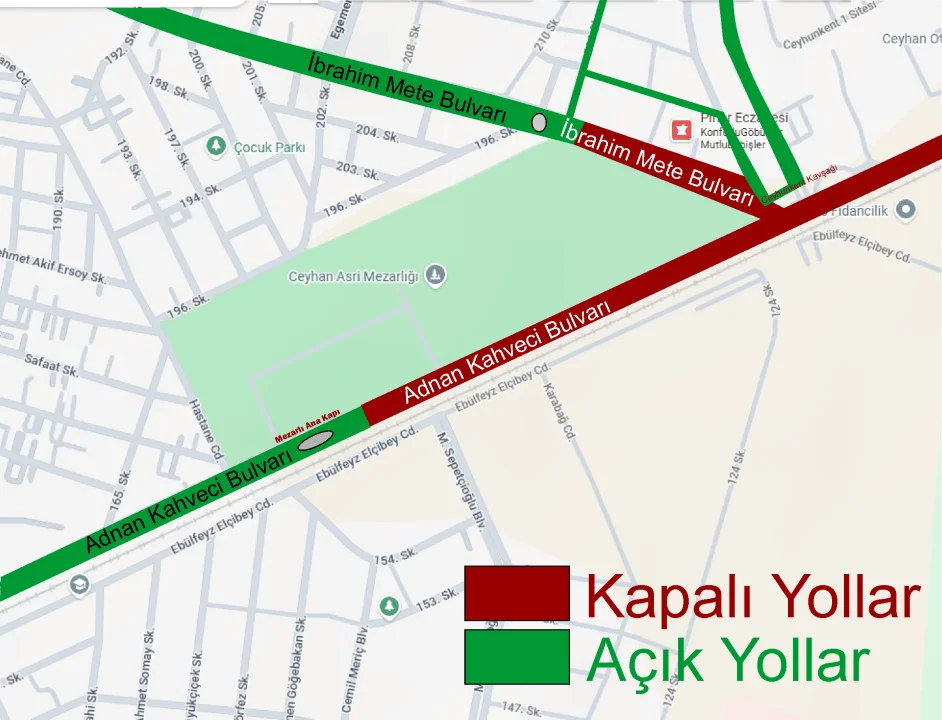 Adnan Kahveci Bulvarı: Kent Meydanı Kavşağı’ndan otogar yönüne doğru, Asri Mezarlık ana kapısına kadar yol açık kalacak. Ancak Mezarlık ana kapısından sonrası çift taraflı olarak ulaşıma kapatılacak.