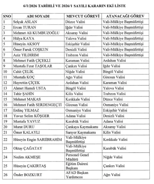 6 Ocak 2026 tarihli Resmi Gazete’de yayımlanan kararname ile Türkiye genelinde 19 ilin valisi değişirken, 7 vali mülkiye başmüfettişi olarak merkeze çekildi. Kararname, mülki idarede kapsamlı bir değişimi beraberinde getirdi.